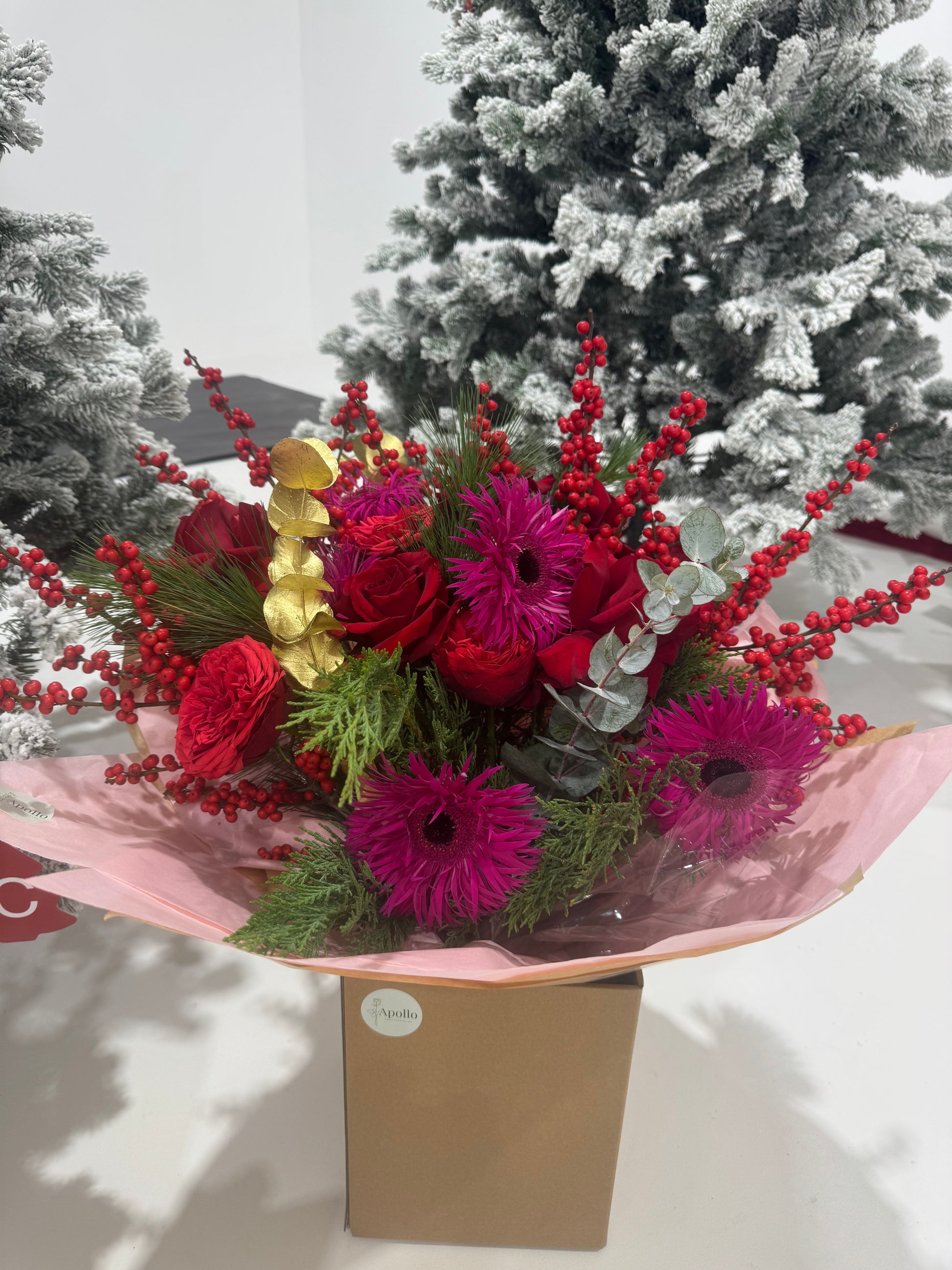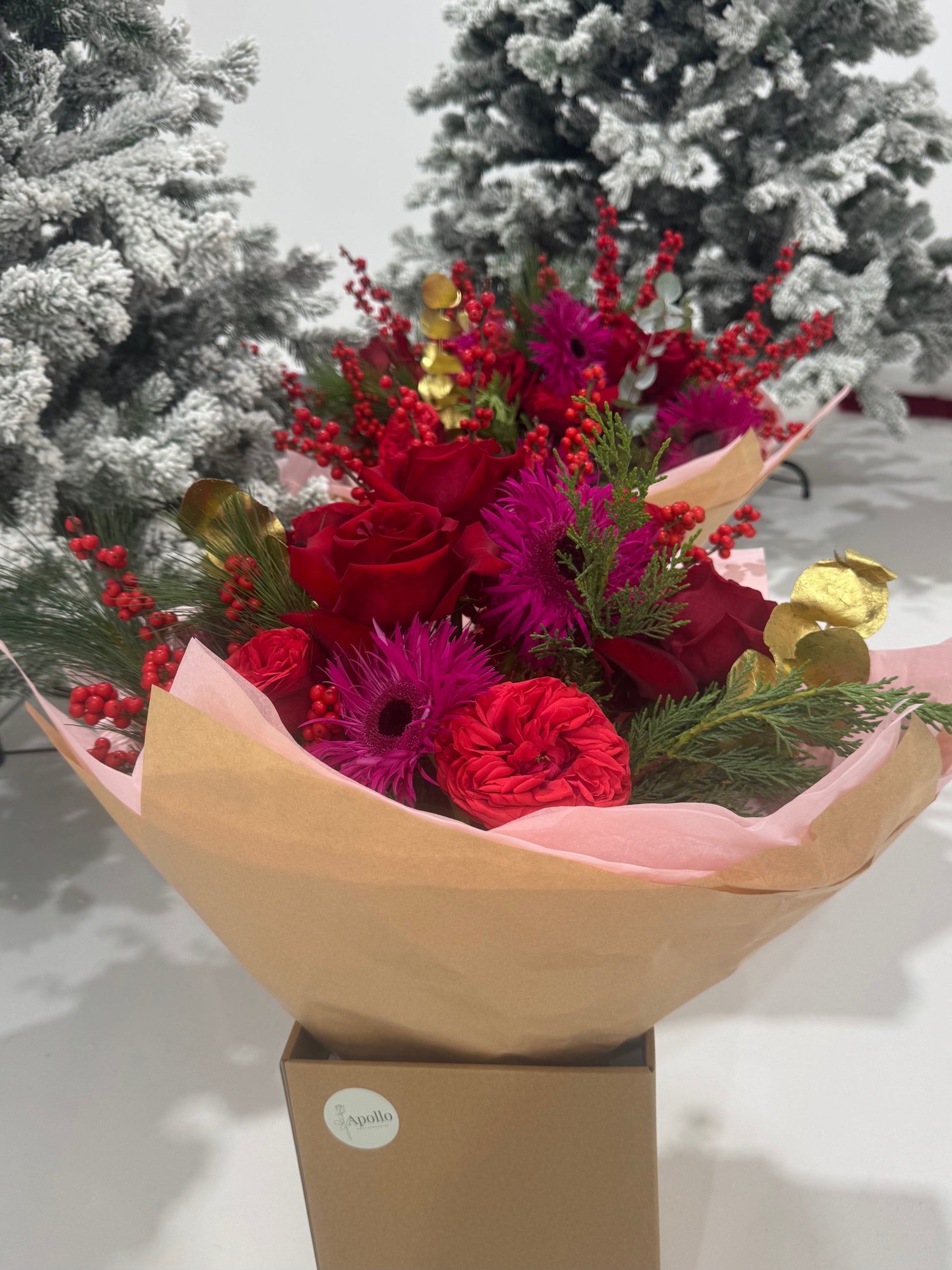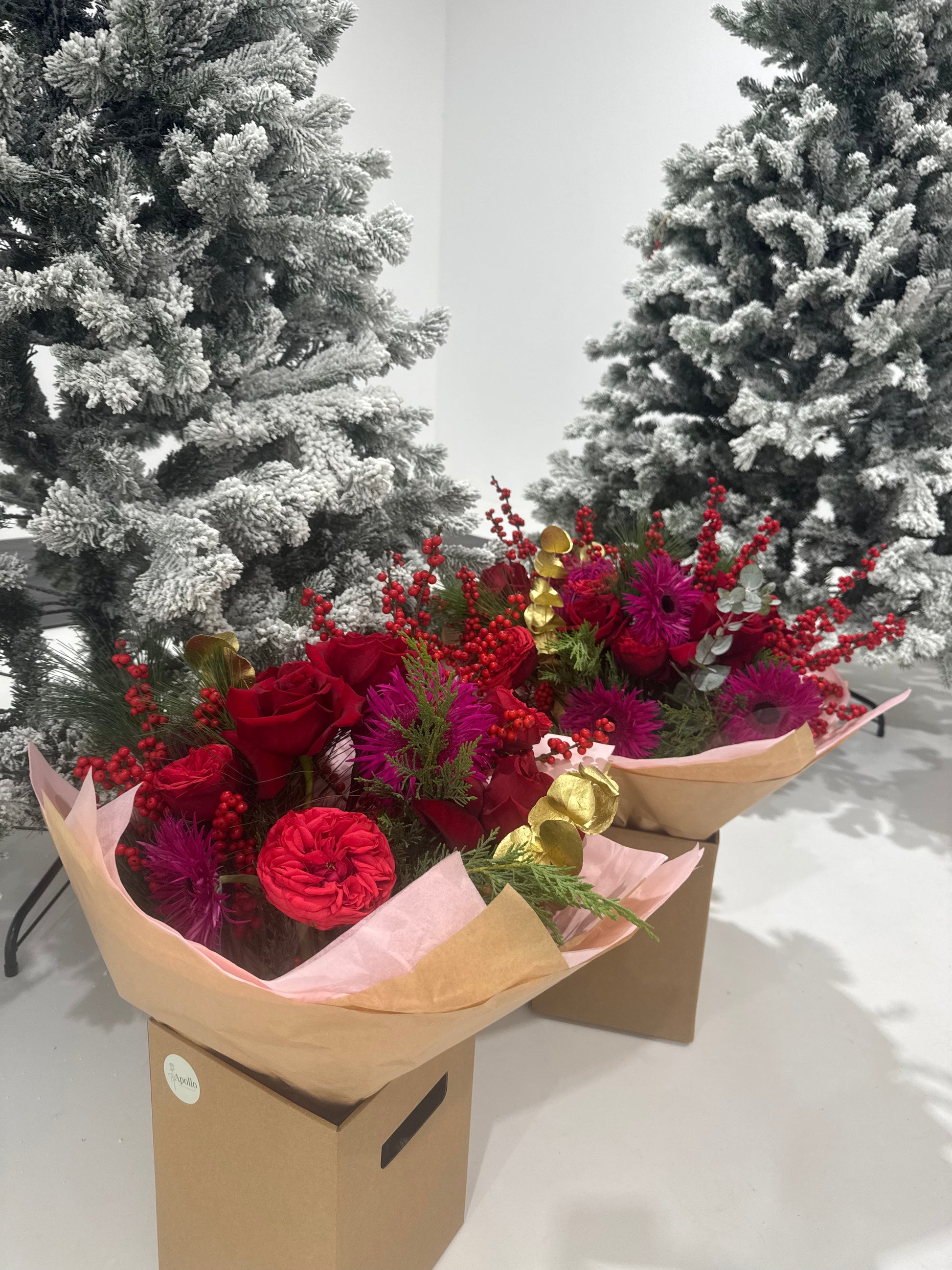 The Definitive Christmas Statement. A luxurious, hand-tied edit of classic red roses, festive berries, and fragrant pine, reinvented with the cool finish of modern eucalyptus.