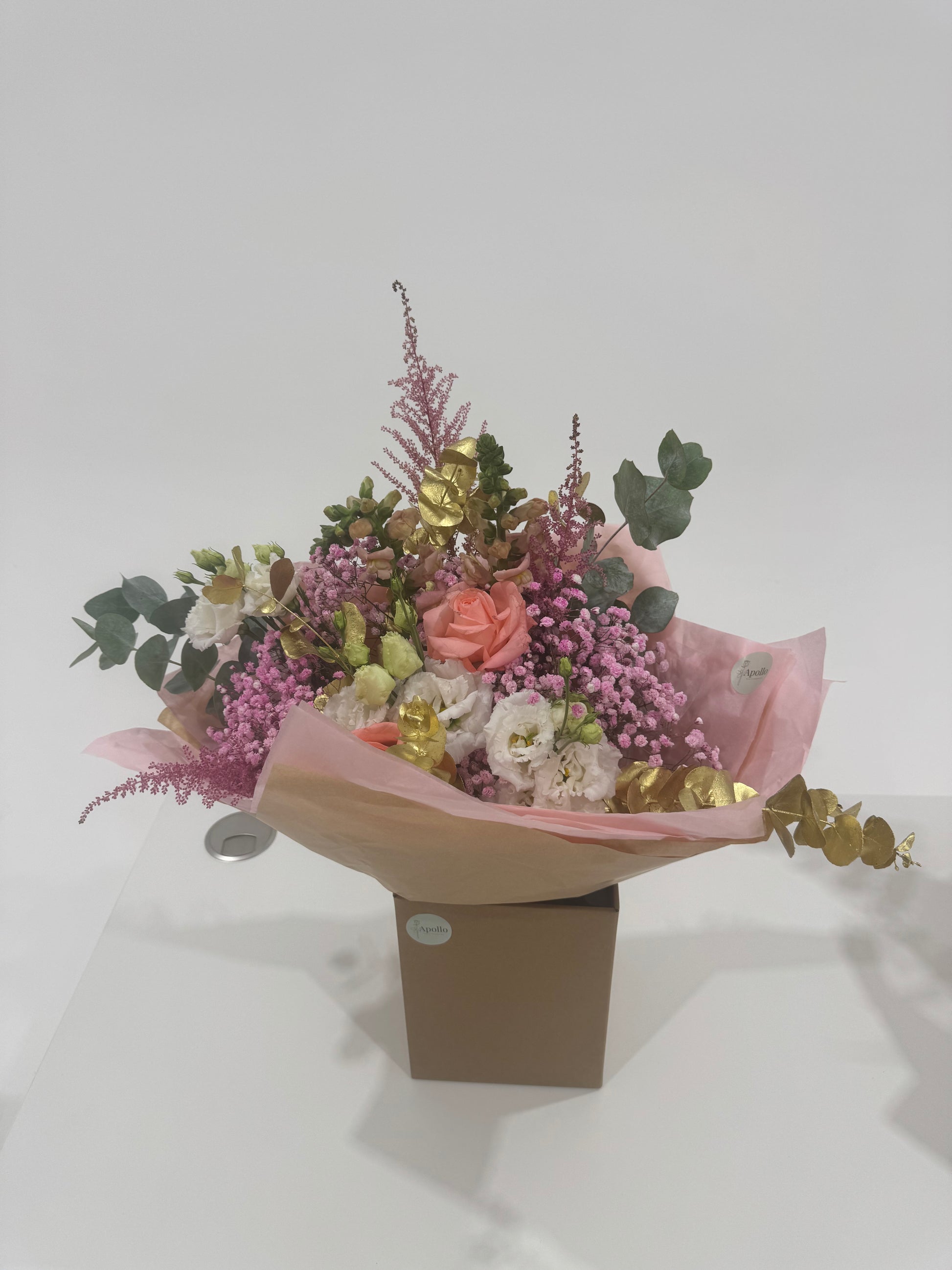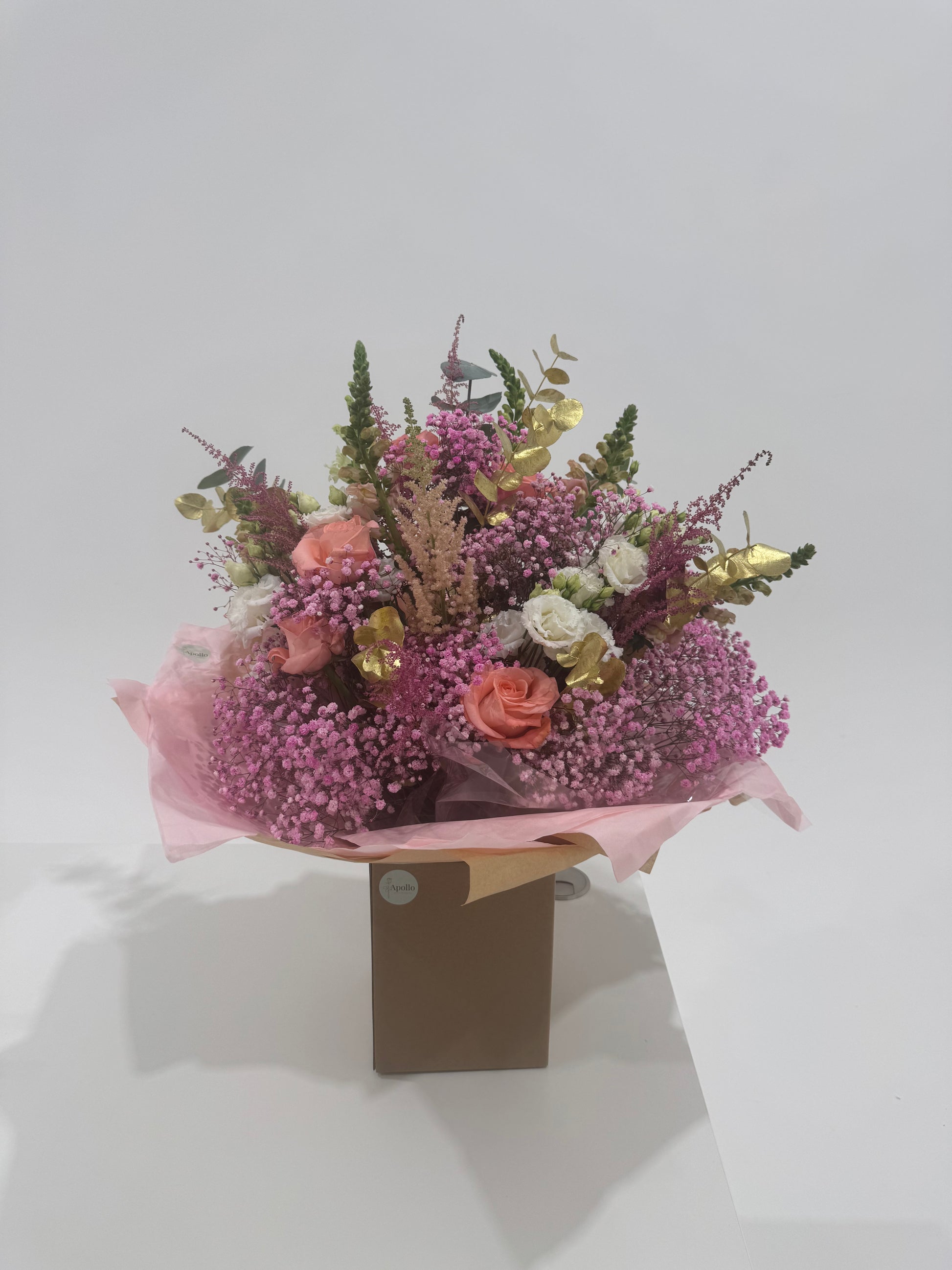 Featuring soft pink Gypsophila (Baby’s Breath) with a modern twist. Gyp Fusion is a chic and feminine arrangement ideal for birthdays and celebrations. With its elegant yet playful vibe, this bouquet adds a fresh, sophisticated flair to any special day. A thoughtful, stunning gift for those who love a feminine touch!